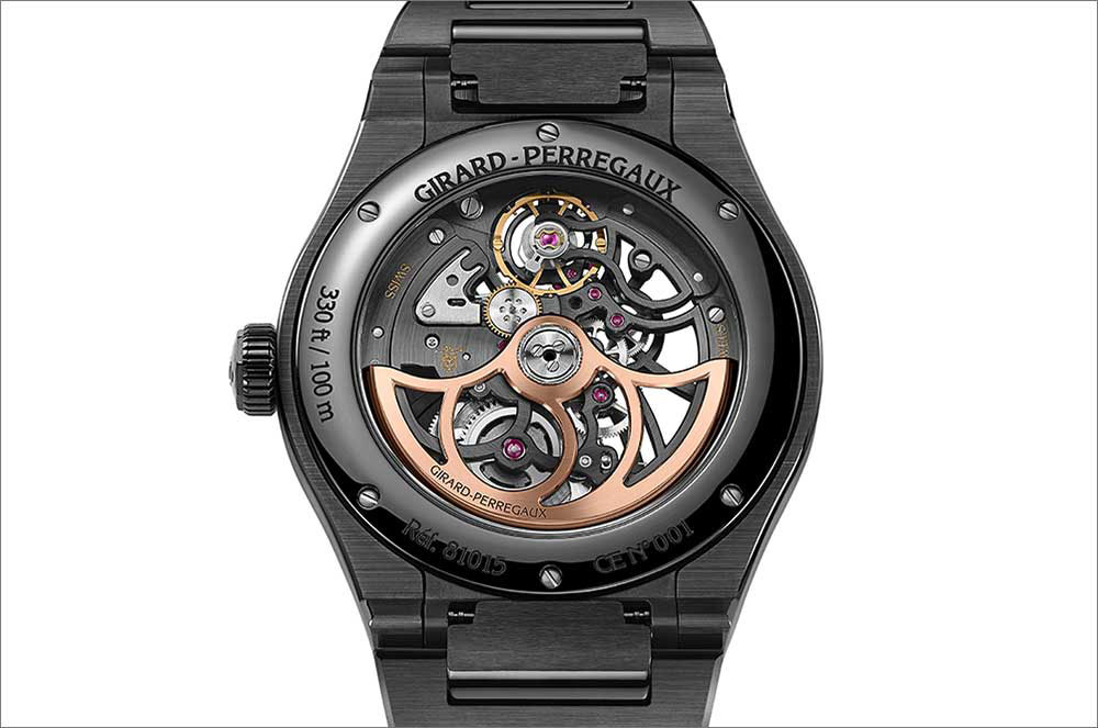 지름 42mm의 일체형 케이스와 브레이슬릿은 모두 세라믹 소재로, 전체 검정색이지만 표면 처리를 유광 광택과 무광 새틴 처리를 번갈아 적용해 보는 각도에 따라 달리 보인다. 다이얼 사이로 보이는 스켈레톤 무브먼트의 브릿지 등 부품도 전체적으로 PVD 처리해 블랙 세라믹과 색을 맞췄으며, 케이스백으로 보이는 로터는 핑크 골드 소재를 사용했다. 원과 팔각 형태를 결합한 베젤, 돔형 이너 링크 연결한 H자형 브레이슬릿, 다이얼 10시 방향에 배치한 스몰 세컨즈 등은 전작 그대로다.