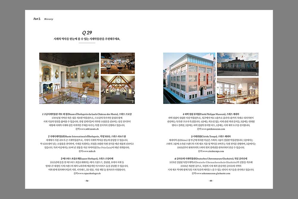 이 가운데 반가운 책이 나온다. 레뷰 데 몽트르 코리아에서는 그간 Q&A 코너를 통해 매호 3개 이상의 문답 기사를 진행해 왔다. 여기에 몇 가지를 추가해서 <시계 100문 100답, 100 Q&A about Watch>이란 제목으로 책으로 엮어 발간한다. 시계매뉴얼에서 진즉 내고 싶었던 책이었으나 아쉽진 않다. 그 코너의 일정 부분을 시계매뉴얼이 맡아 기사를 제공했기 때문에 오히려 뿌듯함을 느끼며 환영한다.