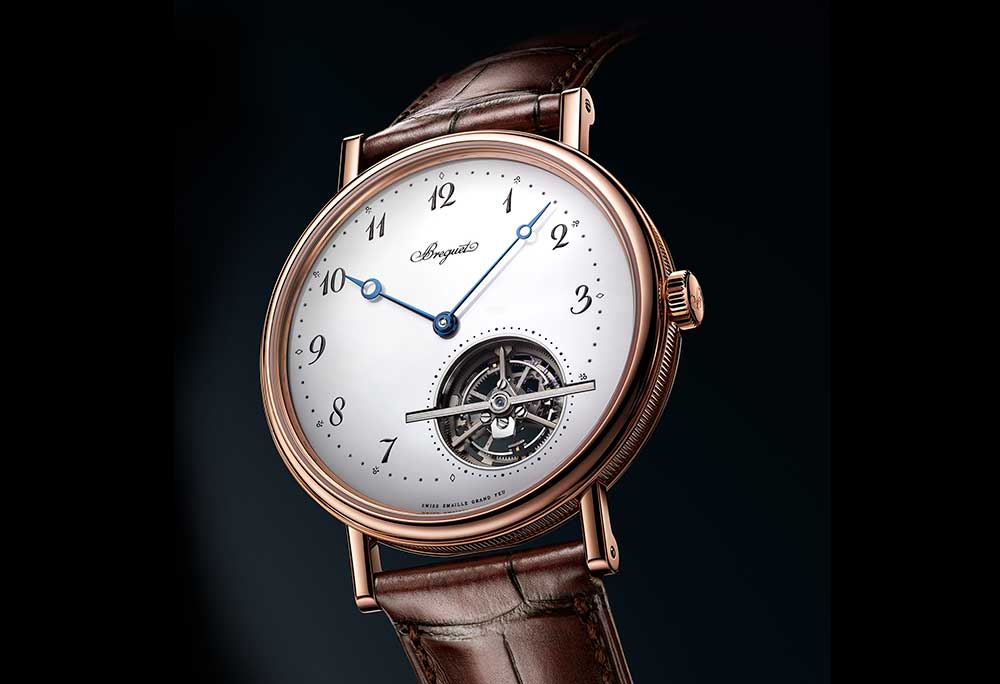 클라시크 컬렉션은 과거 브레게가 소개했던 요소들을 가득 담고 있다. 섬세한 기요셰, 로마숫자 인덱스, 블루 핸즈, 플루티드 …2013년 브레게는 창립자가 고안해 특허까지 받았던 투르비용에 새로운 바람을 불어 넣었는데 그 결과물이 바로 그랜드 컴플리케이션 투르비용 엑스트라-플랫 오토마티크 5377이다. 플래티넘과 핑크 골드 케이스에 기요셰를 넣은 다이얼을 가진 시계는 5시 반 방향에 투르비용을 배치했는데 실리콘 소재의 밸런스 스프링과 이스케이프 휠을 티타늄 캐리지가 감싼 구조다. 581DR 자동 기계식 무브먼트는 두께 3mm로 가장 얇은 자동 투르비용 무브먼트로 등극했다. 4Hz의 성능에도 특허받은 고효율 배럴로 90시간 파워 리저브도 가능했다.