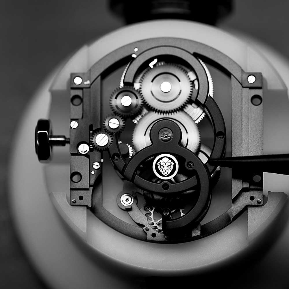 - skeleton dial – black ADLC treatment brass bridge and plate