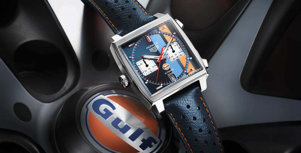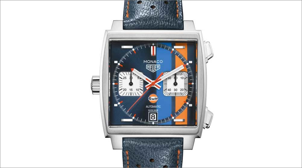 태그호이어와 걸프 오일은 이미 2005년부터 인연이 있었다. 당시 스티브 맥퀸의 75번째 생일을 기념하는 4천개만 한정 생산한 시계로 영화에서 입었던 운전복의 빨강과 파랑 줄무늬를 다이얼에 넣었다. 2007년에는 르망에서 맥퀸이 운전한 포르셰 917을 걸프 오일이 후원하면서 걸프 II 모델을 제작했고 이때 다이얼에 ‘모나코’ 대신 ‘걸프’라는 단어가 들어간 로고와 함께 특유의 파랑과 주황 줄무늬를 넣었다. 2009년 세 번째로 소개한 걸프 III은 다이얼 배경색을 빈티지 그레이 컬러로 바꿨고 탑재한 칼리버 12를 케이스백으로 드러냈다.