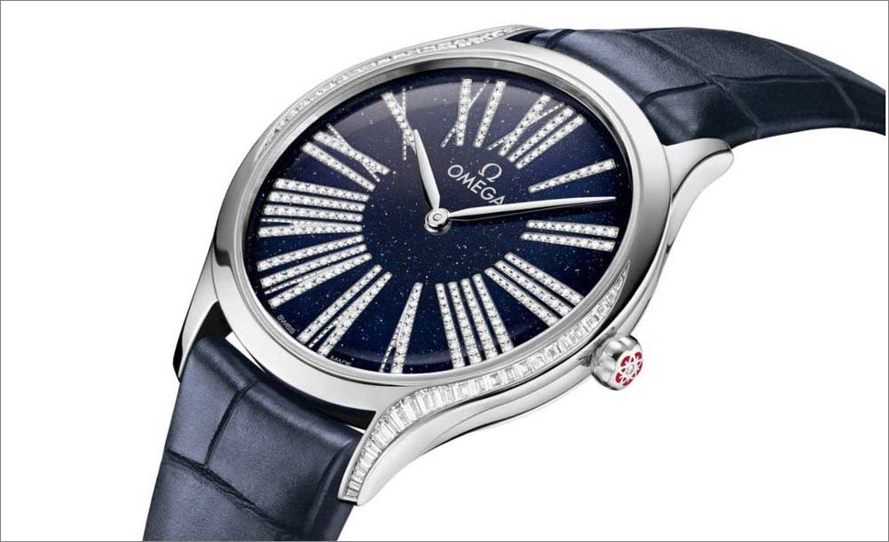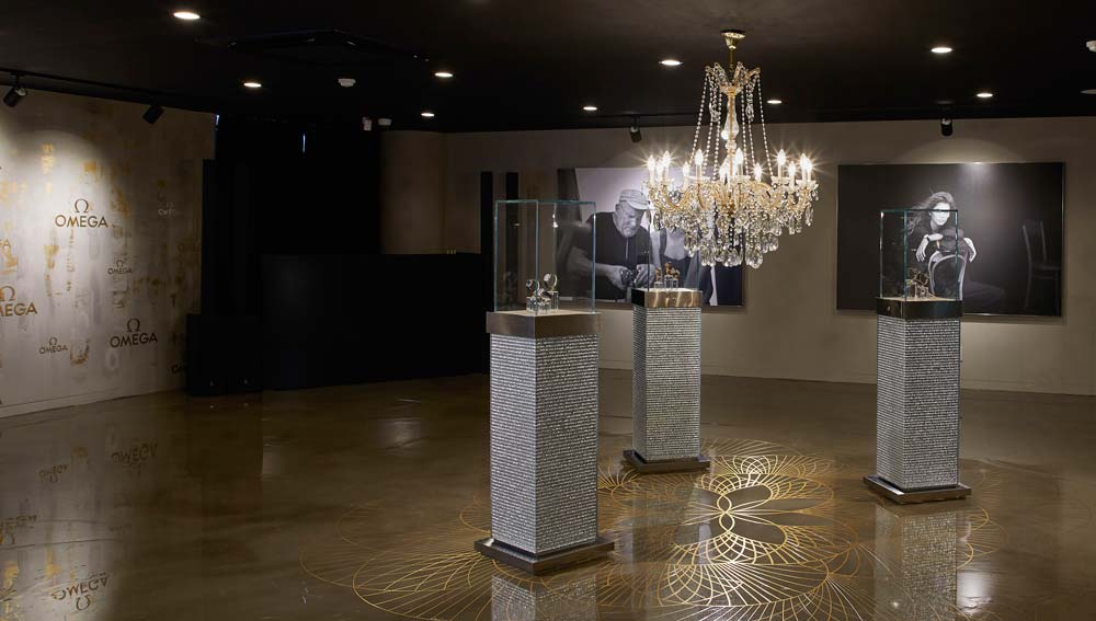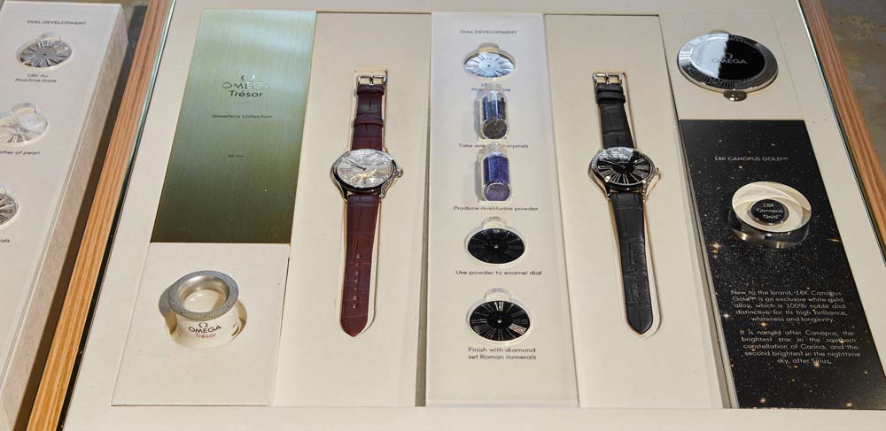 어벤추린 다이얼은 원석을 얇게 켜 다이얼을 만드는 기존 방법 대신 어벤추린 원석을 빻아 가루를 만들어 에나멜처럼 발라 굳히는 기법을 적용했다. 자개 다이얼과 마찬가지로 로마숫자 인덱스를 양각으로 남긴 골드 플레이트에 어벤추린 분말을 바르고 약 1,000도의 가마에서 굽기를 4~5회 반복했다. 이 과정을 통해 골드 인덱스와 다이얼 표면이 같은 높이를 이루도록 만들었다. 어벤추린은 경도가 낮기 때문에 자개처럼 투조 기법을 사용할 수 없기 때문에 고안한 방법이다. 케이스는 금, 팔라듐, 백금, 로듐을 혼합해 화이트 골드에 비해 밝기, 백색도, 수명을 높인 오메가의 독점 합금, 카노푸스Canopus 화이트 골드를 사용했다. 새로운 트레저 컬렉션 론칭 기념 전시회는 오는 12월 말까지 오메가 청담 부티크에서 계속 진행되며, 제품을 직접 체험할 수 있는 다양한 기회를 제공할 예정이다.