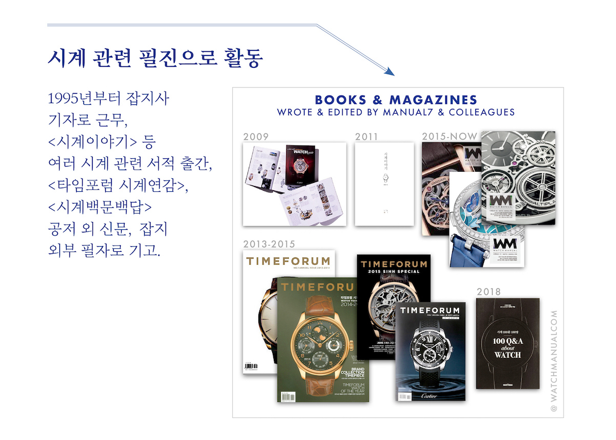 1995년 말부터 잡지기자로 패션, 뷰티, 피처 분야를 거쳐 2007년부터 본격적으로 시계 분야를 취재해 온 WM이 운영하는 곳입니다. 하늘길이 막혔던 2020년, 2021년을 제외하고 지난 16년간 바젤월드, SIHH, 워치스앤원더스, 두바이워치위크 등을 꾸준히 취재해 왔습니다. 2009년부터 <시계이야기> 등 시계 관련 책을 발간하고 온라인 커뮤니티인 타임포럼 대표로 시계 연감을 발행했으며, 몽트르 잡지에 기고한 원고를 모은 <시계백문백답>의 공동저자로 참여하기도 했습니다.