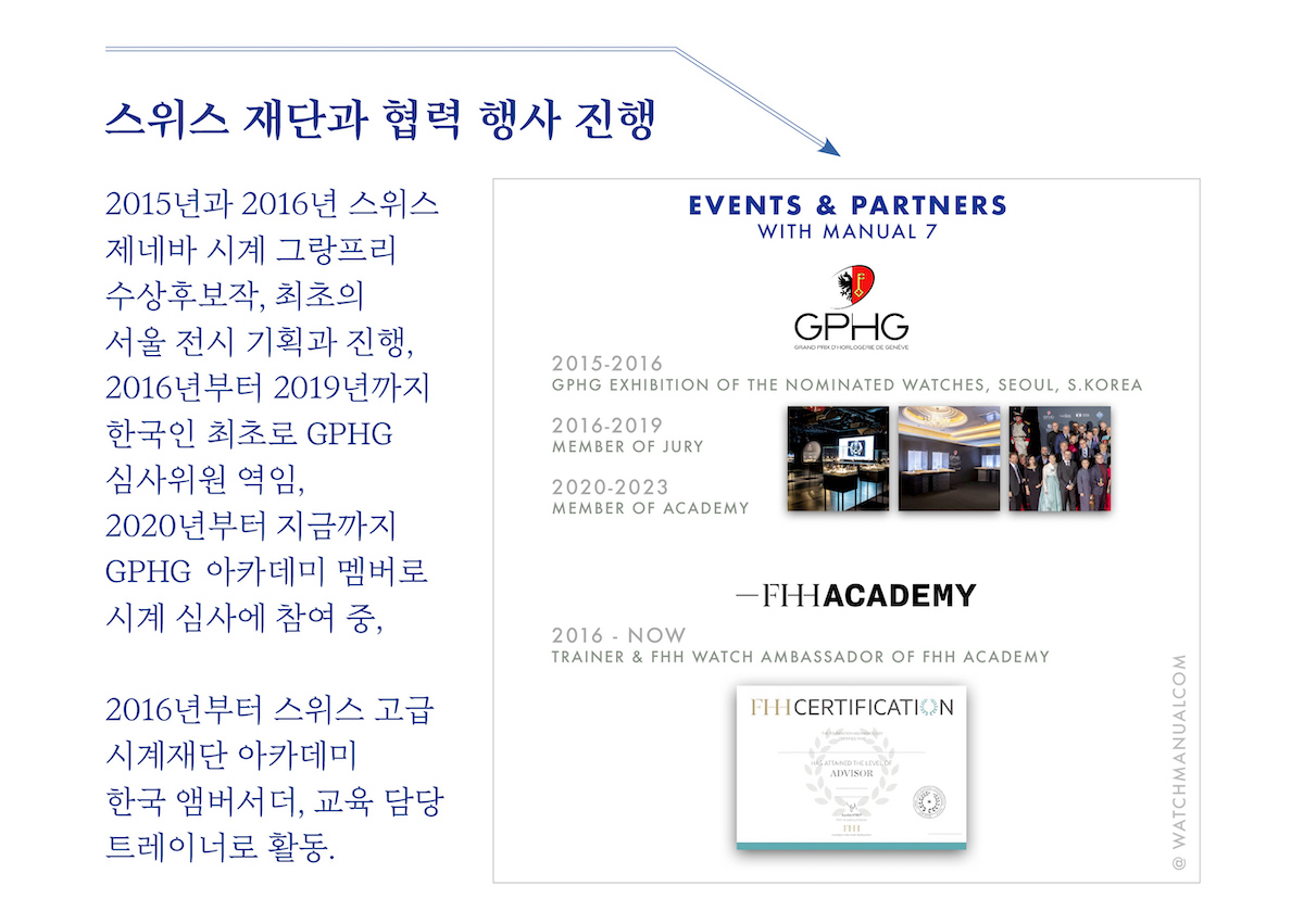 2015년에는 시계업계의 오스카상으로 불리는 제네바 시계 그랑프리 서울 전시단독 기획자로 활동, 2015년 현대카드 라이브러리, 2016년 롯데호텔에서 수상후보작의 전시를 진행했습니다. 2016년부터 2019년까지 제네바 시계 그랑프리의 심사위원으로 활동했고, 그랑프리 직전 시계를 심사하는 현지 심사위원은 전세계 25~30명으로 한국인으로는 최초이자 유일한 일원으로 참여했습니다. 2020년과 2021년은 행사가 열리지 않았으나 GPHG 아카데미 멤버로 활동, 추천한 한국 멤버들과 함께 현재까지 투표에 참여하고 있습니다.